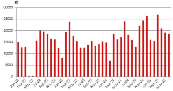 同时,来自上海链家研究院的数据显示,2025年1-6月,上海新房市场累计成交2.54万套,与2024年上半年相比总成交量持平,月均成交4237套,除1-2月受春节影响成交量回调,其余月份均保持单月4000套以上的成交。